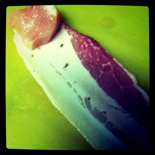 Start out by cutting the chicken into cubes, about 1" cubes works best. Then using kitchen scissors cut the bacon strips in half. Put a piece of the chicken on one of the cut bacon strips and roll until it's covered, use a toothpick to keep the bite closed.